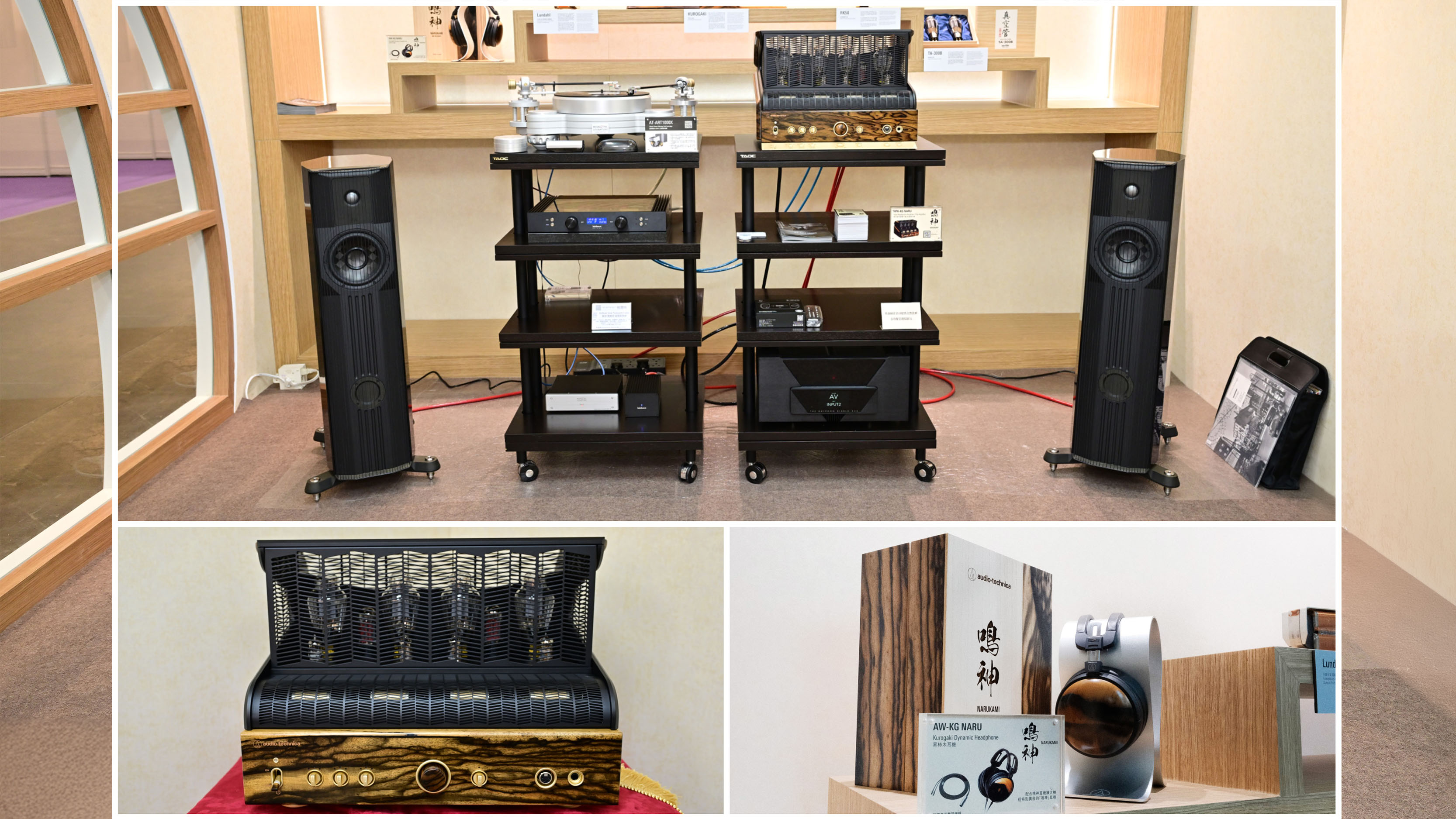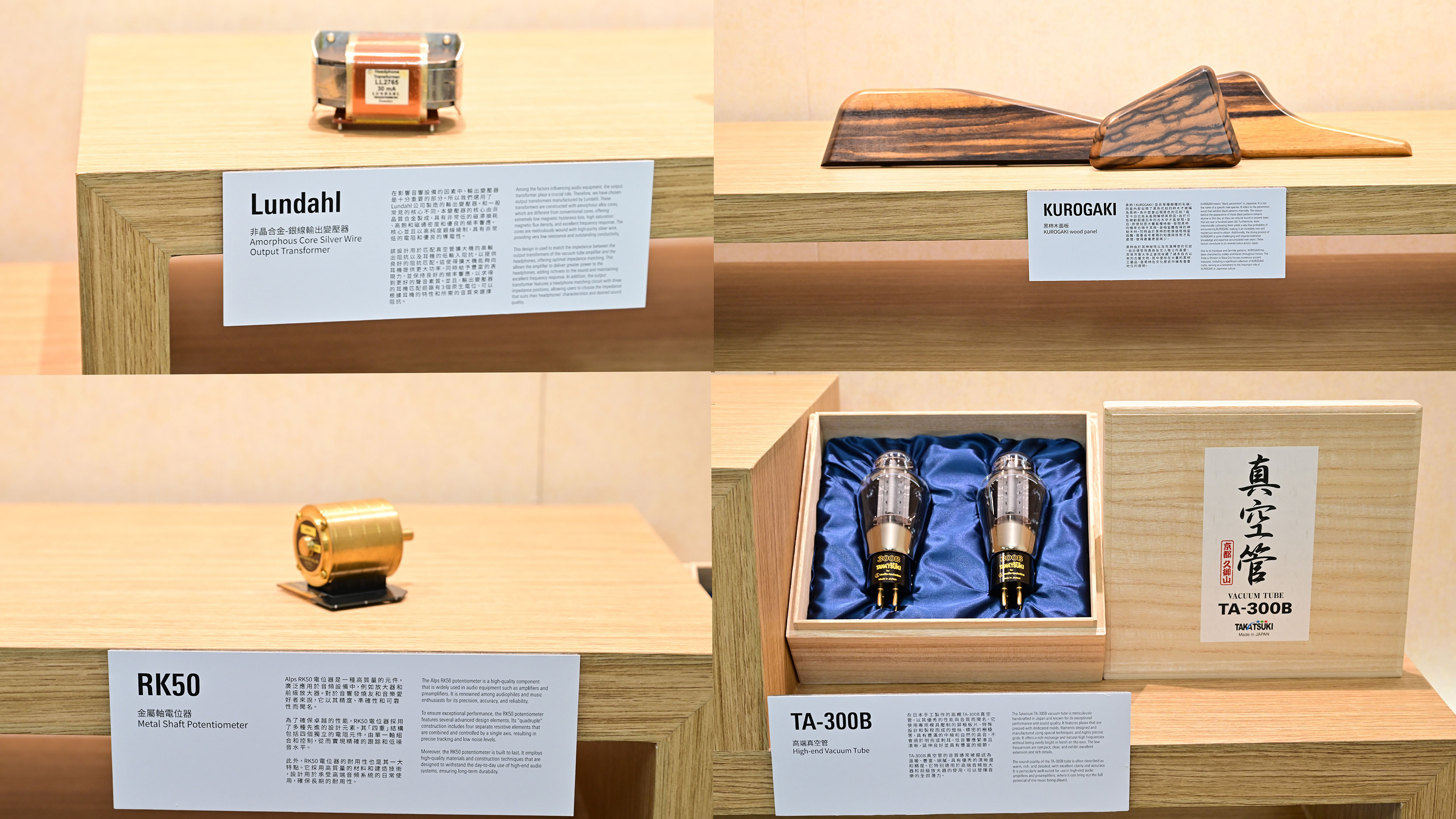在鳴神系列視聽區,參觀者有機會近距離欣賞HPA-KG NARU 擴大機的零件和材料。展出的零件包括:黑柿木面板、TA-300B 高端真空管、Lundhal 非晶合金-銀線輸出變壓器,以及RK50 金屬軸電位器。