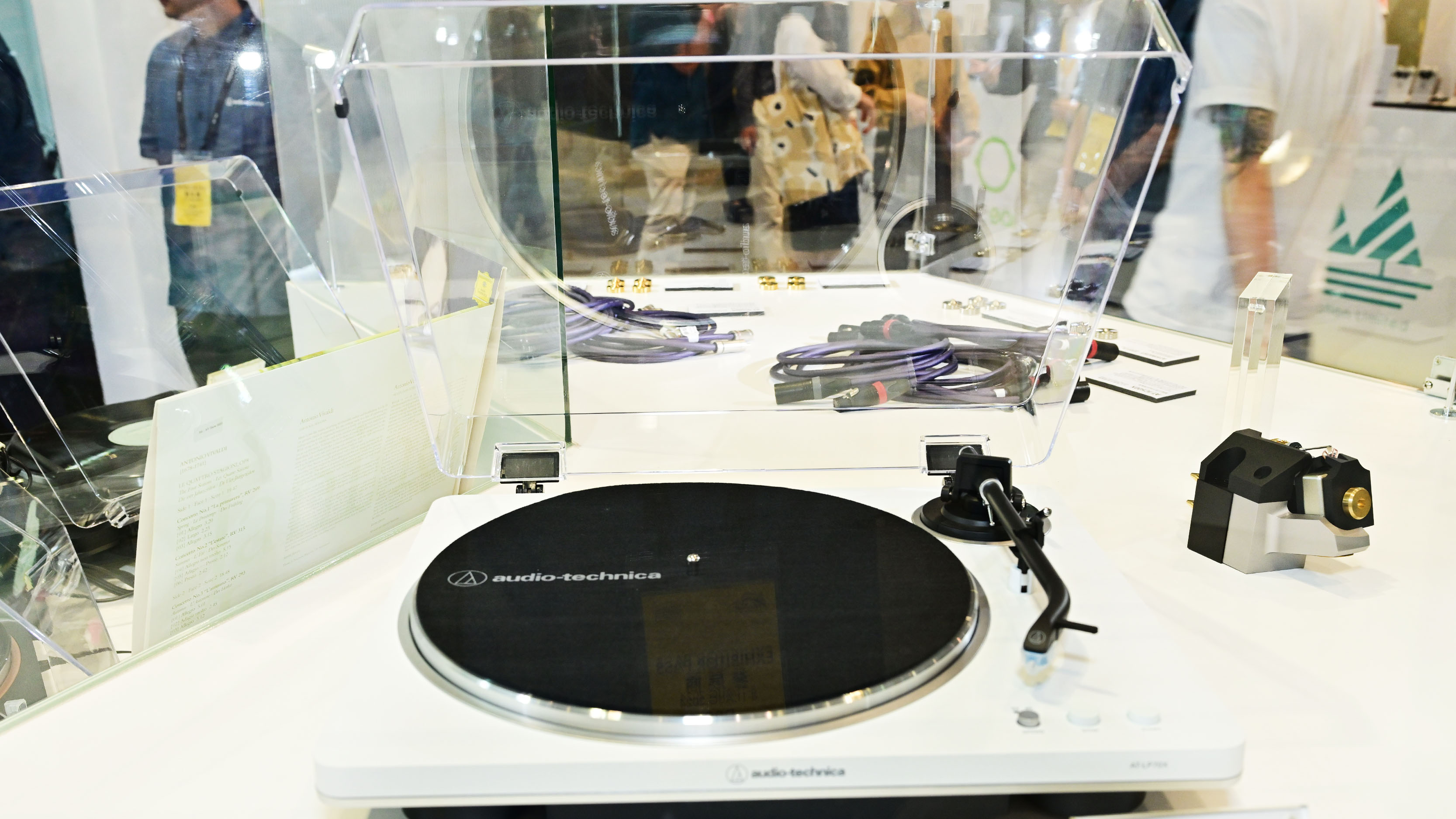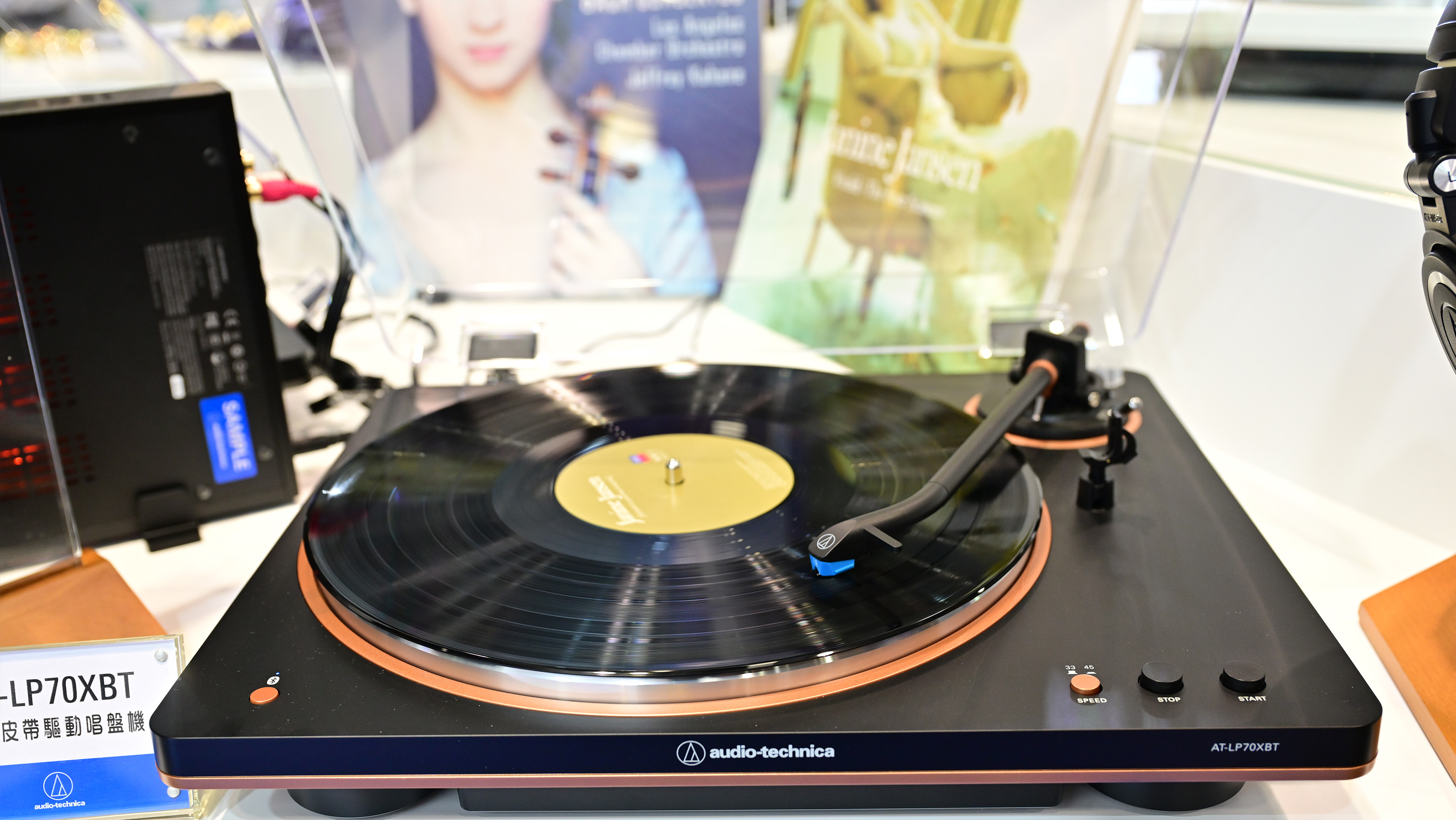 展示區外側,展出了最新推出的 AT-LP70X 以及 AT-LP70XBT 黑膠唱盤,吸引了眾多黑膠唱片愛好者的目光。這兩款唱盤專為黑膠愛好者設計,提供卓越的音質和多樣化的功能選擇,讓黑膠新手也能輕鬆體驗黑膠美妙好聲音。
