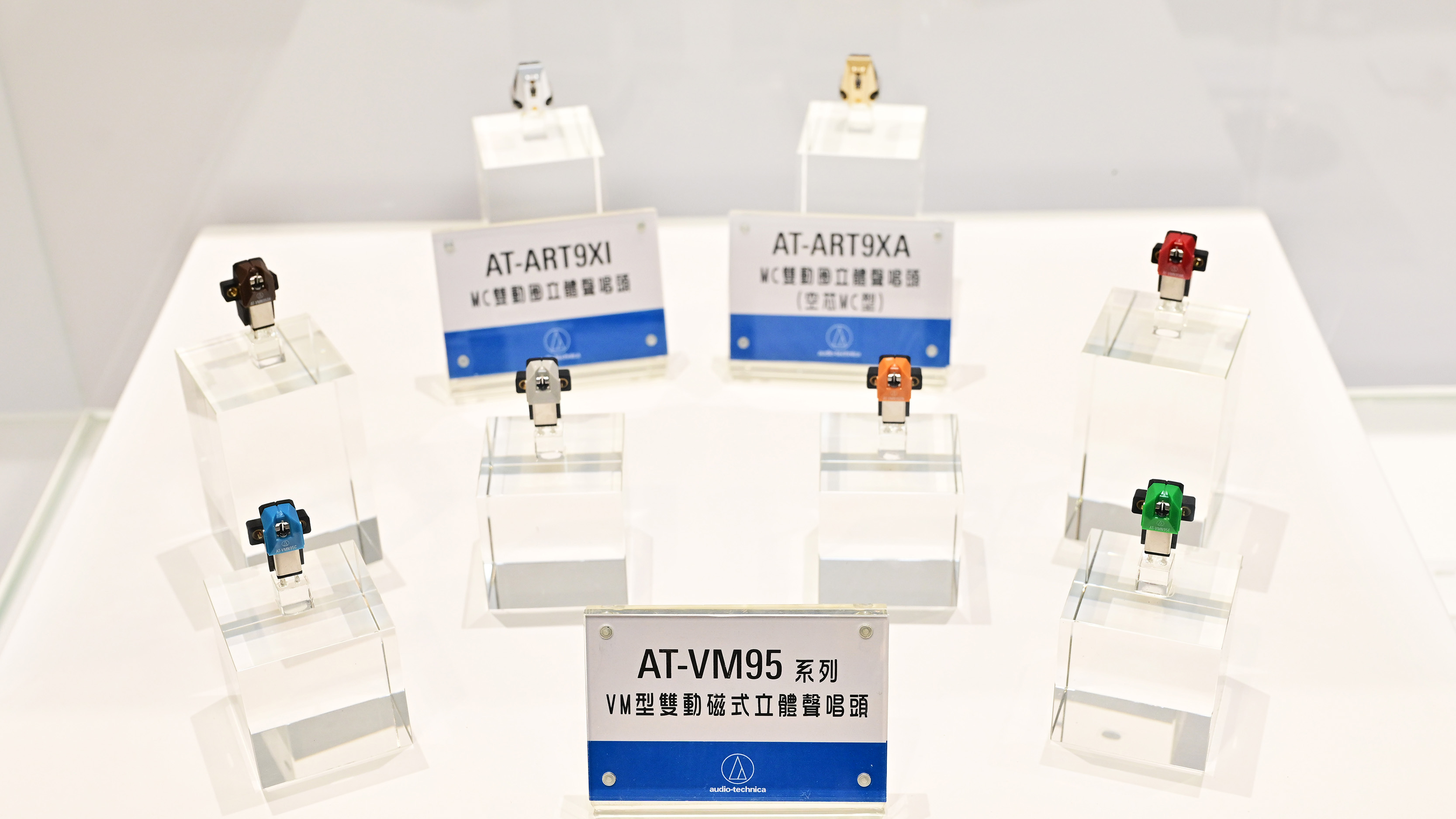 AT-VM95 系列唱頭展示區,此系列的唱頭均可使用AT-VMN95系列交換針,提供多種選擇的聆聽體驗。