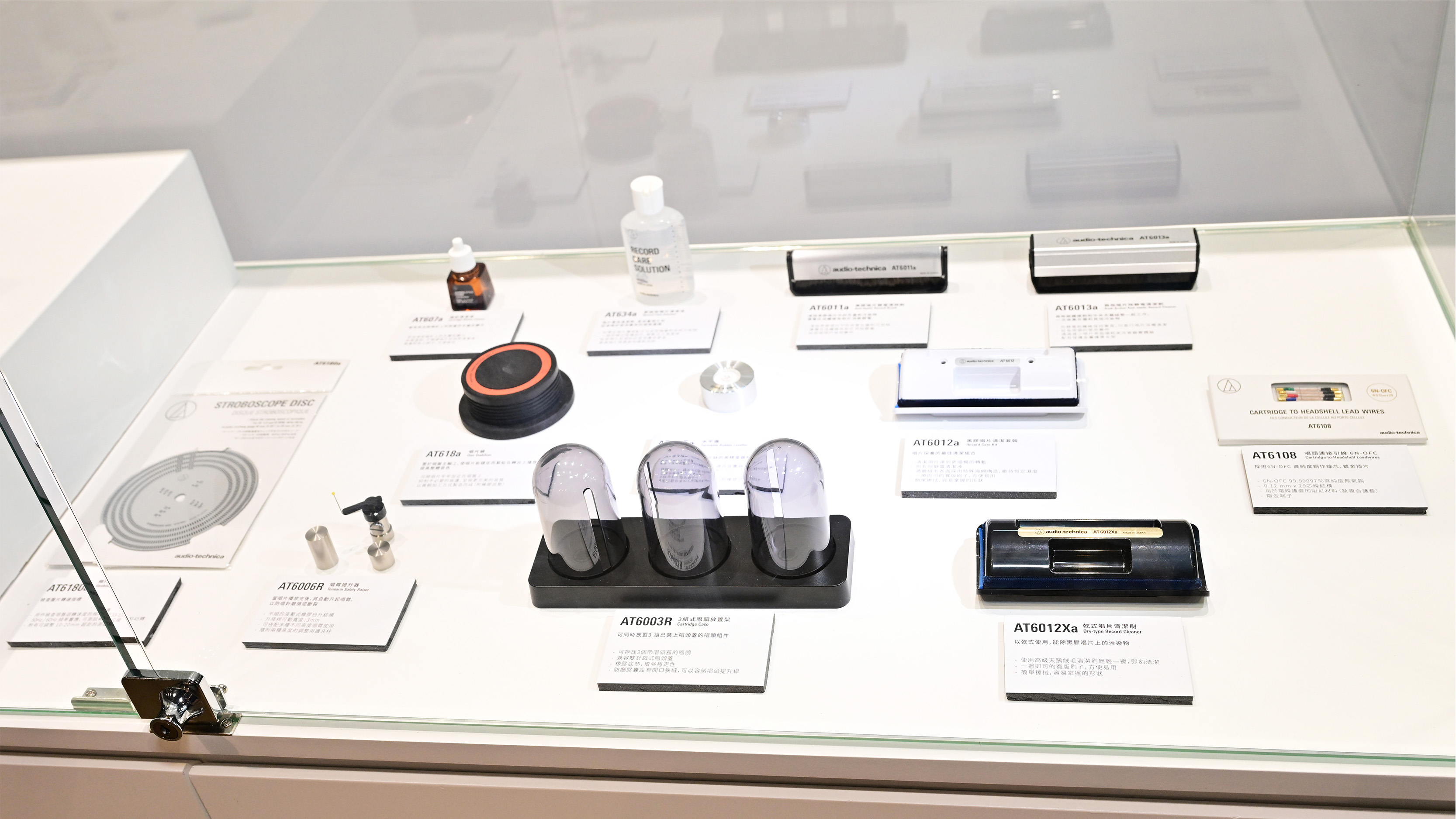 鐵三角的唱盤清潔用品和其他唱盤配件展示區,分別有: