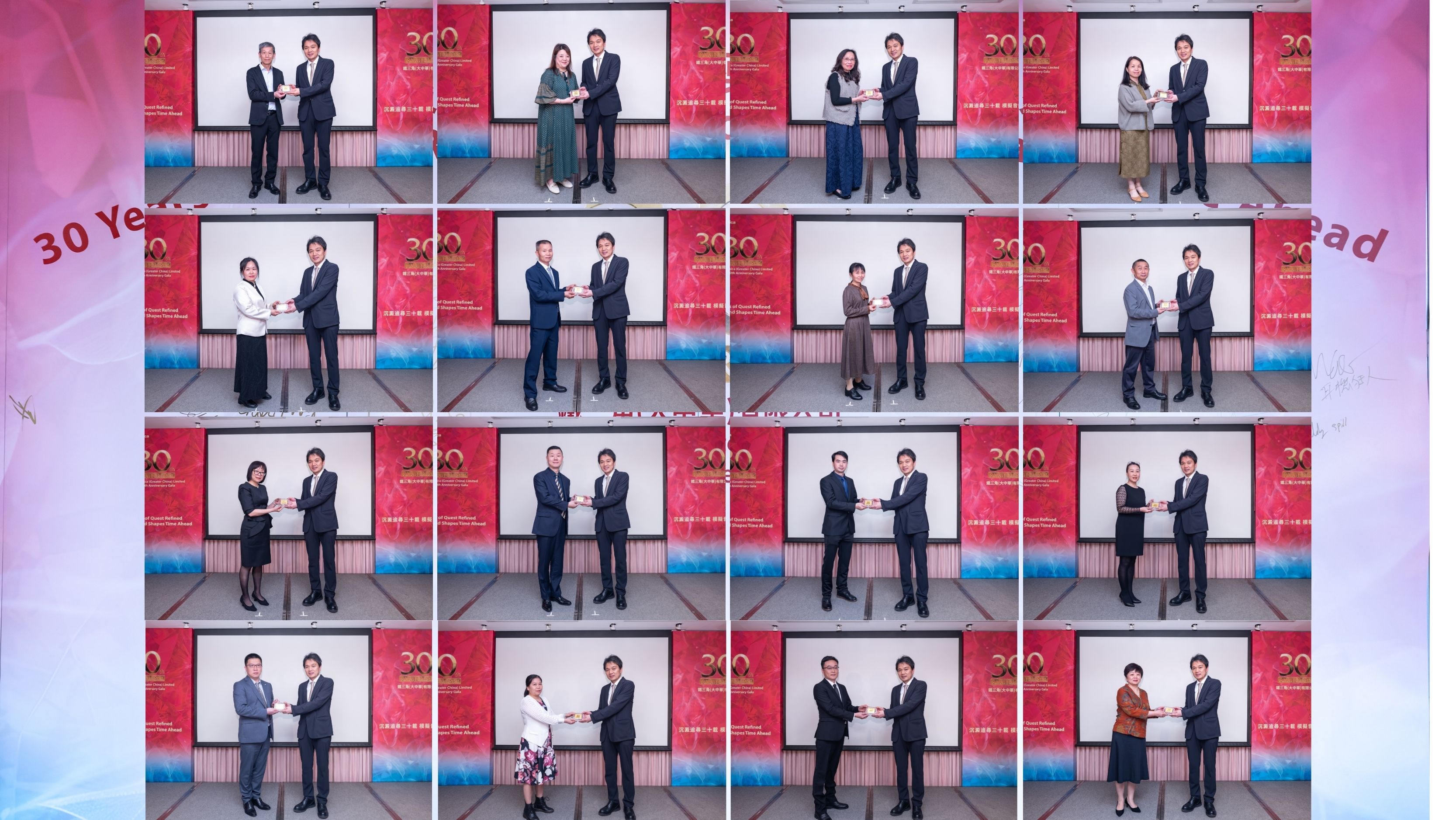 在慶典尾聲,松下和雄先生親自為一眾服務鐵三角(大中華)三十年的員工頒發長期服務獎,向自公司創立以來始終與企業風雨同舟、堅守崗位的同仁致以最誠摯的敬意。他們的奉獻與堅持,是鐵三角穩健發展不可或缺的基石。