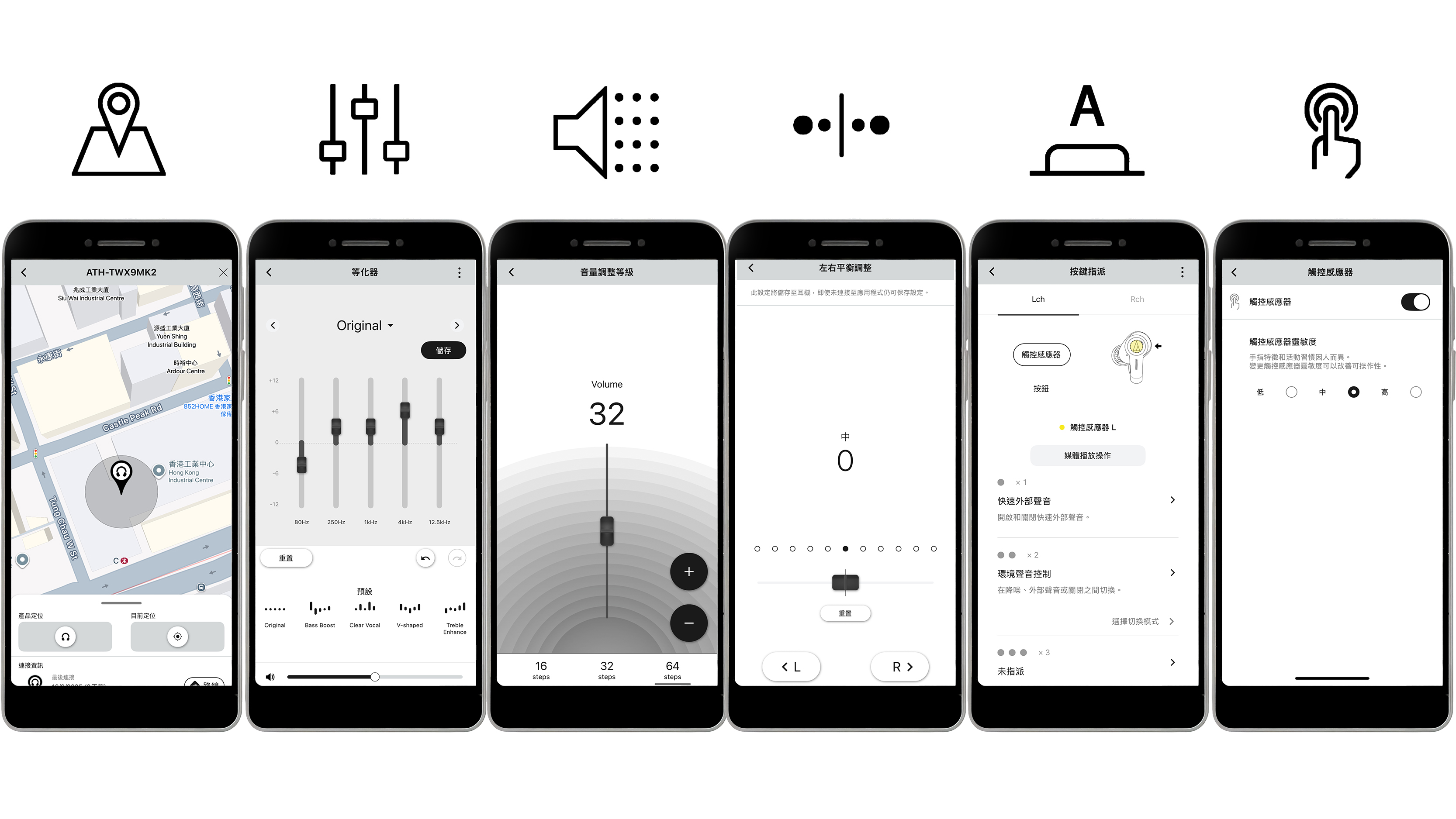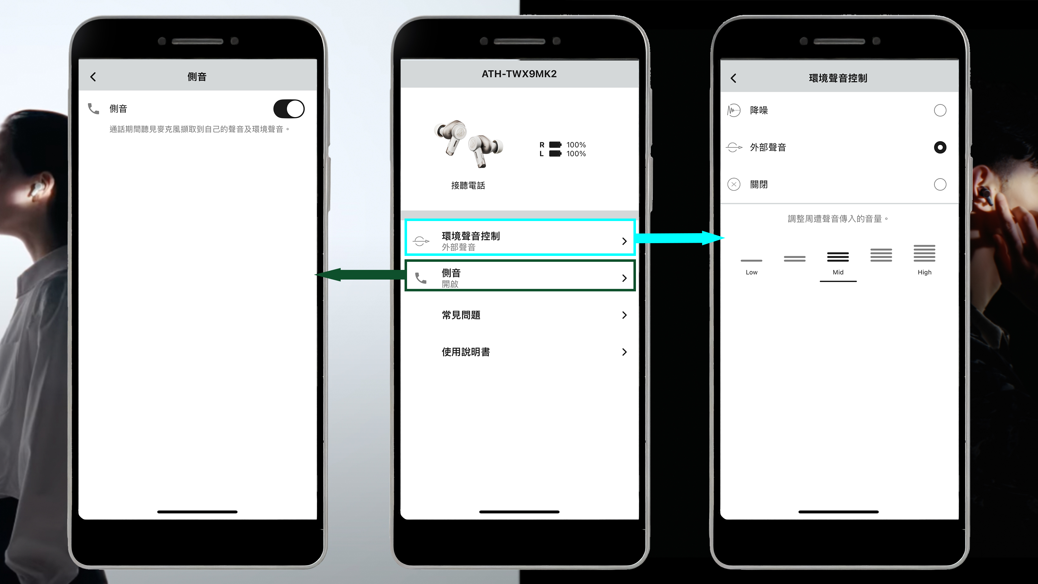 * 透過專屬應用程式「A-T Connect」,可依需求調整環境音的收音比例,共提供5階段設定,實現更細緻的聆聽體驗。