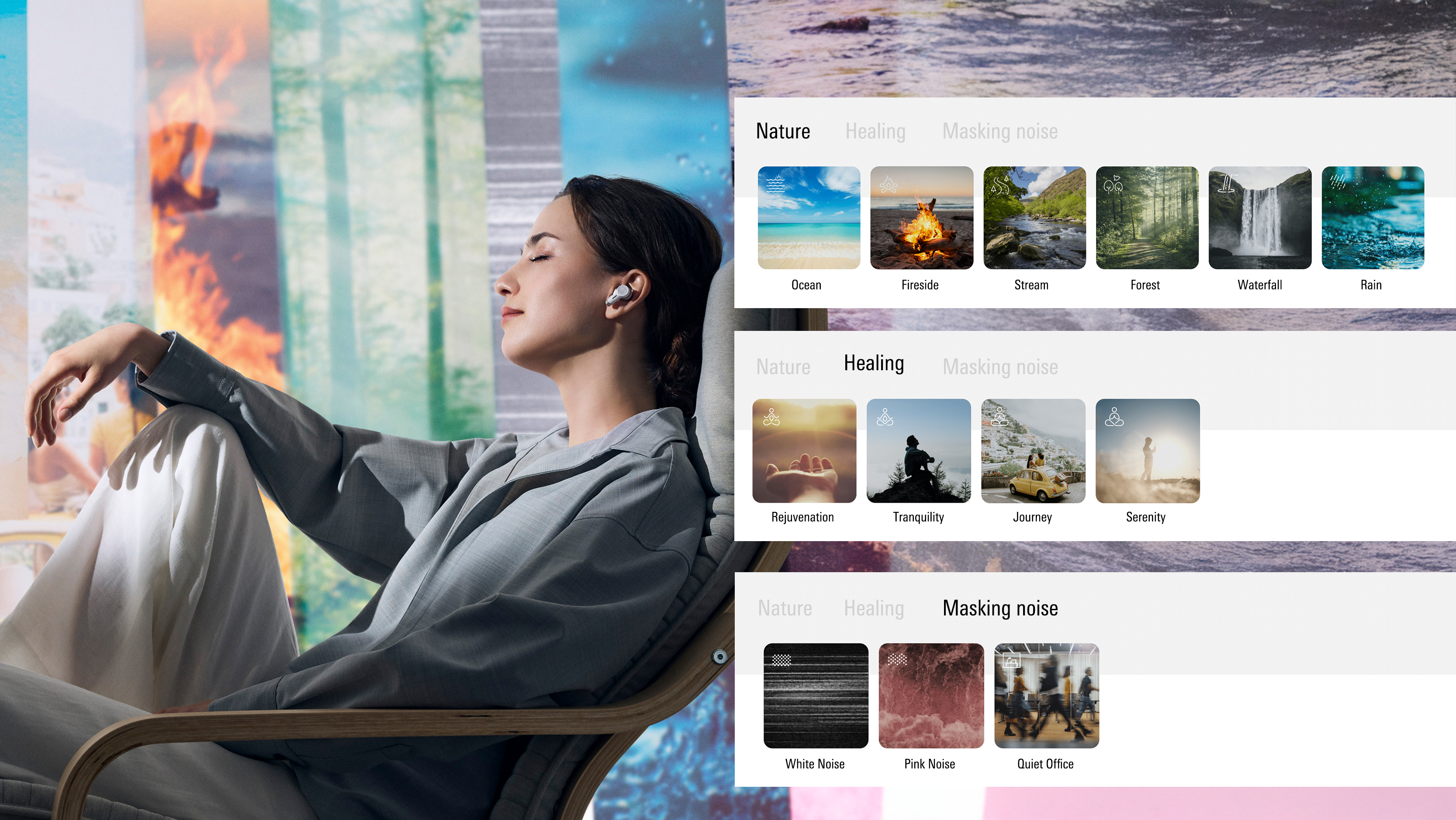 透過 A-T Connect 應用程式,可聆聽以鐵三角麥克風錄製的大自然環境聲,營造放鬆與安定氛圍。亦可選擇遮蔽噪音以提升專注力,或播放療癒音效以輔助冥想與放鬆心情,讓您沉浸於平靜舒緩的聲音空間。
