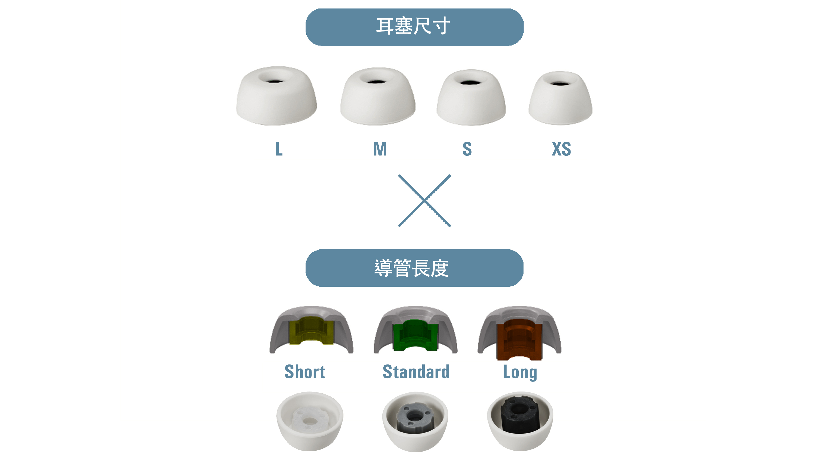 提供多達12種耳塞組合選擇,每個尺寸搭配3種不同長度,可依個人耳型選擇合適的佩戴深度與大小,實現個人化的佩戴體驗。
