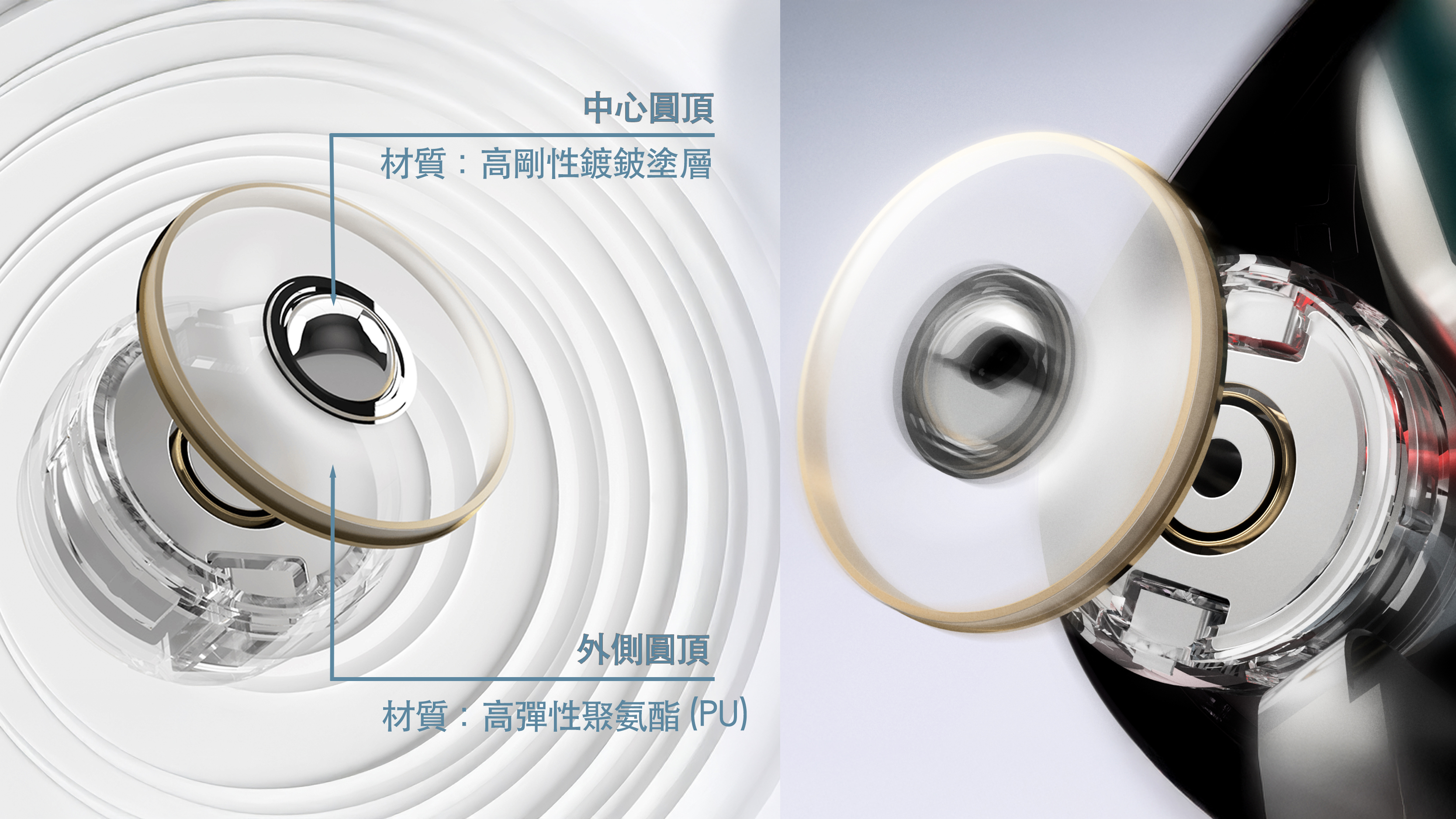 ATH-TWX9MK2 採用複合式結構振膜設計,是驅動單元的一項設計重點。此結構結合剛性與彈性材質:中心圓頂使用高剛性材料,有助於處理高頻,使聲音清晰乾淨;外側圓頂則採用高彈性材質,有利於增強低頻的彈性與厚實感。