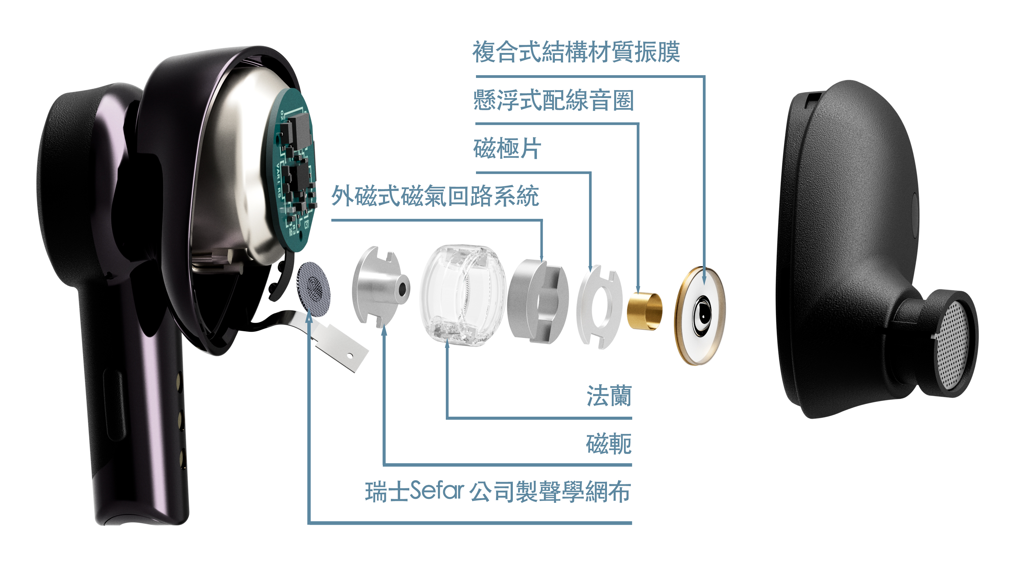耳塞外部的「傘狀結構」可自然貼合耳道,提升密閉性與被動隔音效果,進一步提升主動降噪表現;內部搭配堅韌的軸心設計,能降低聲音傳輸損耗,讓細節豐富的音訊傳遞至耳膜。