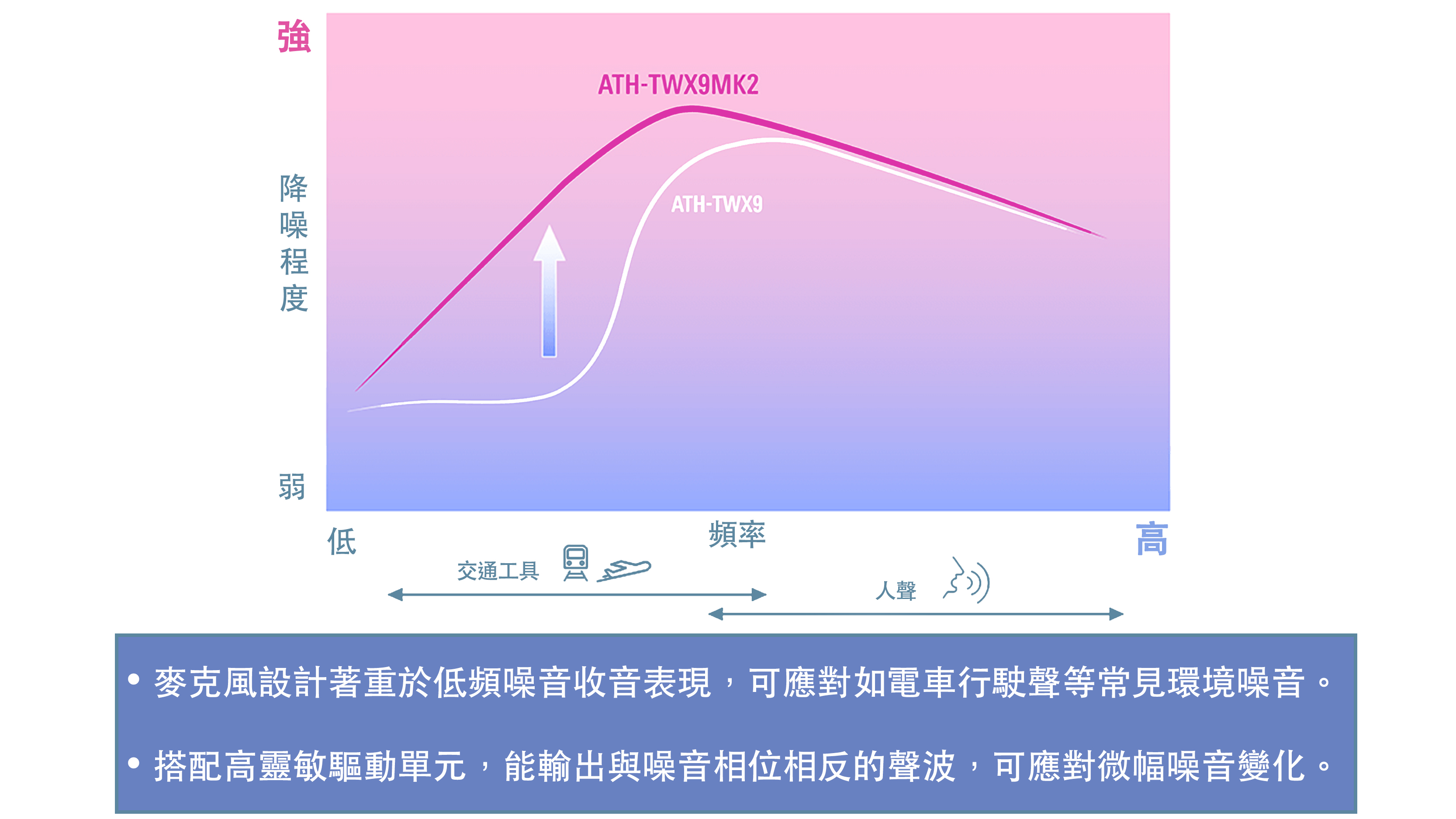 承襲前代產品穩定的降噪設計,ATH-TWX9MK2 採用升級版降噪 MEMS 麥克風與高性能驅動單體,實現降噪功能。每個耳機內建兩組噪音偵測 MEMS 麥克風*,具備穩定的訊噪比(SNR),作為降噪處理的基礎。這些麥克風負責收集環境噪音,並傳送至降噪處理器,由驅動單體產生對應的反向聲波,用以抑制背景音訊。