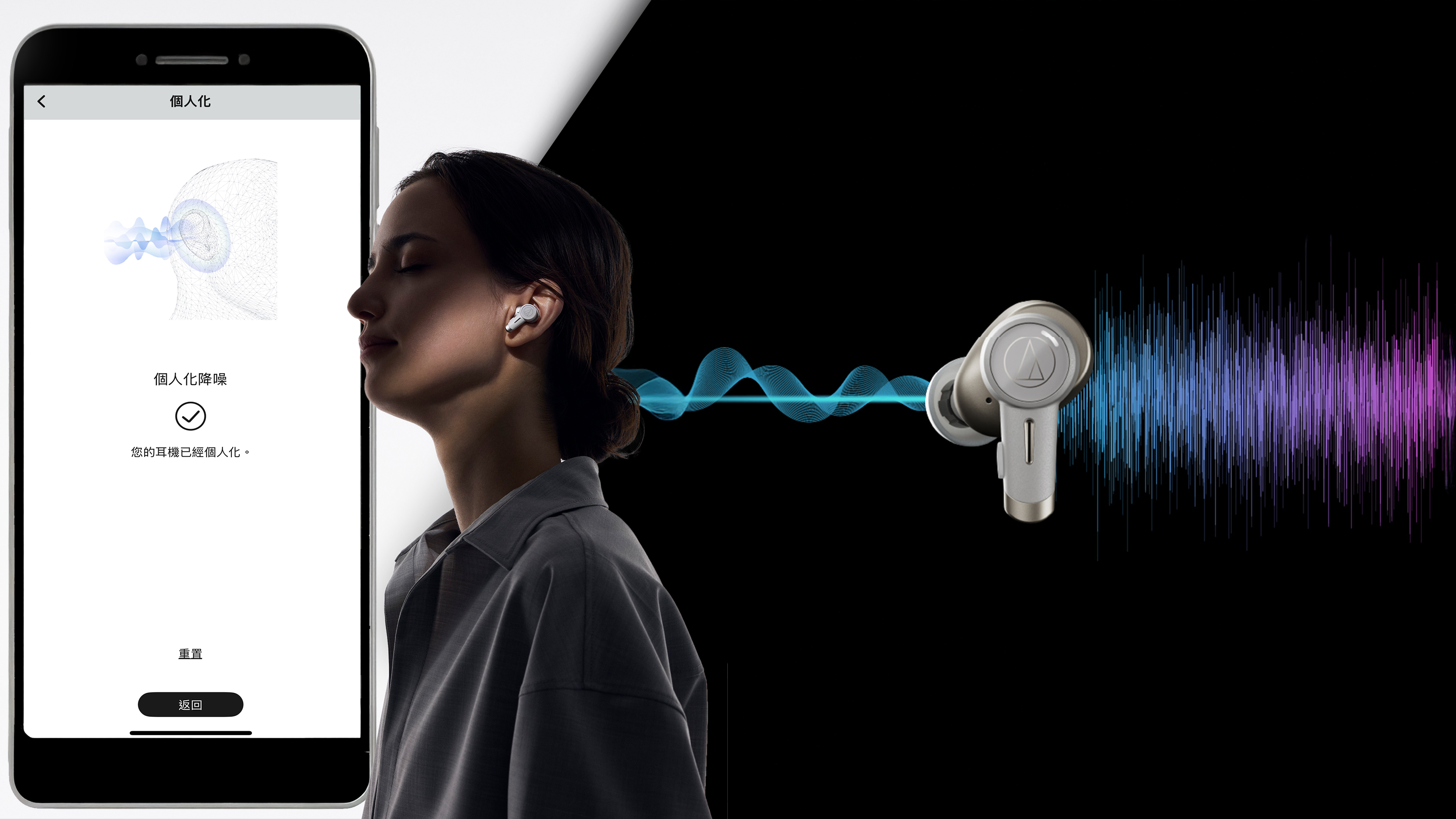 ATH-TWX9MK2 採用個人化降噪系統,可依據使用者耳型與佩戴差異進行調整,確保穩定的降噪效果。佩戴耳機後,系統會播放偵測音,並透過內建麥克風分析耳道輪廓與當前環境的聲音特性,進而套用對應的降噪參數,調整至符合個人使用狀態的降噪設定。