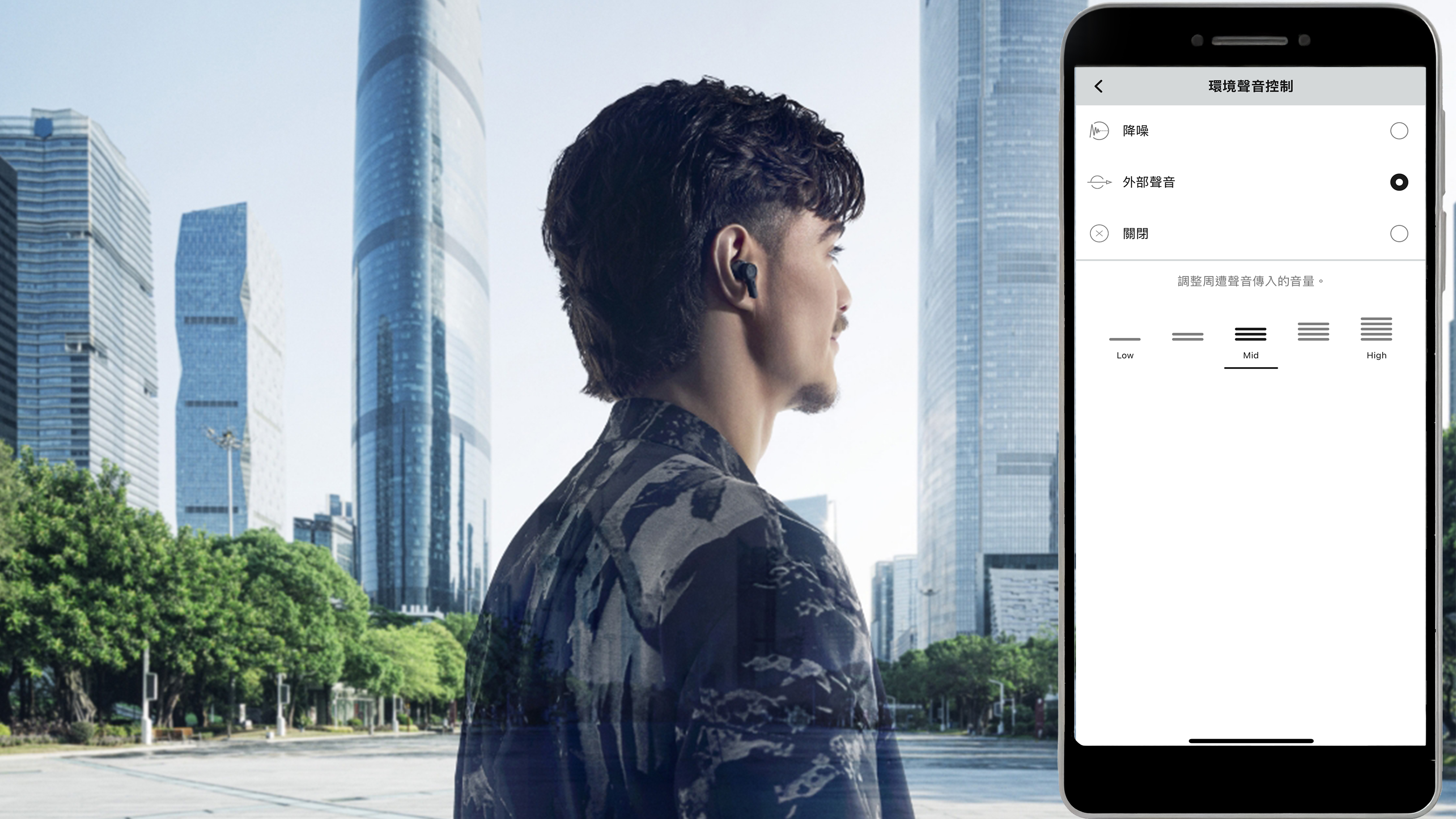 可降低城市風噪。考慮到耳機使用安全,此設定可讓您更容易聽到周遭聲音。 |