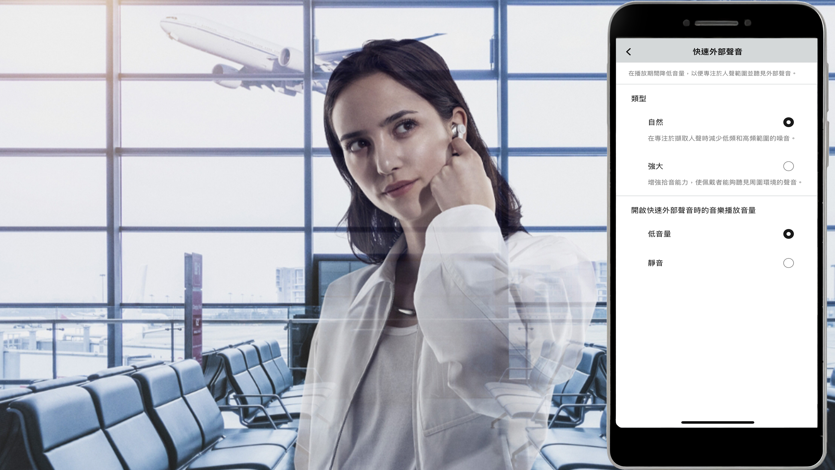 - 外部聲音模式:在與親友通話時,保留周圍聲音,讓對話更自然,就像面對面交談一般。